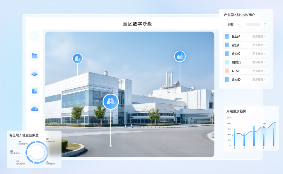 数据显示,2023 年中国工业园区数量突破 2.5 万个,贡献全国 GDP 总量 35% 以上 ,但在国家 “双碳” 战略以及产业升级需求的推动下,工业园区正加速从传统基建驱动向智慧化、绿色化、集约化方向转型。众趣科技助力工业园区实现从宏观到微观的全方位管理升级。在管理方面,通过 BI 数字大屏将园区全域各类资源可视化呈现,实现视频监控、前端感知、设备资产管理等数据资源一张图分层展示,提升管理效率。在绿色发展方面,联动 IoT 设备对园区各办公区域及生产环节的水电气等能耗数据进行实时监测,根据监测结果优化能源分配,推动节能减排。