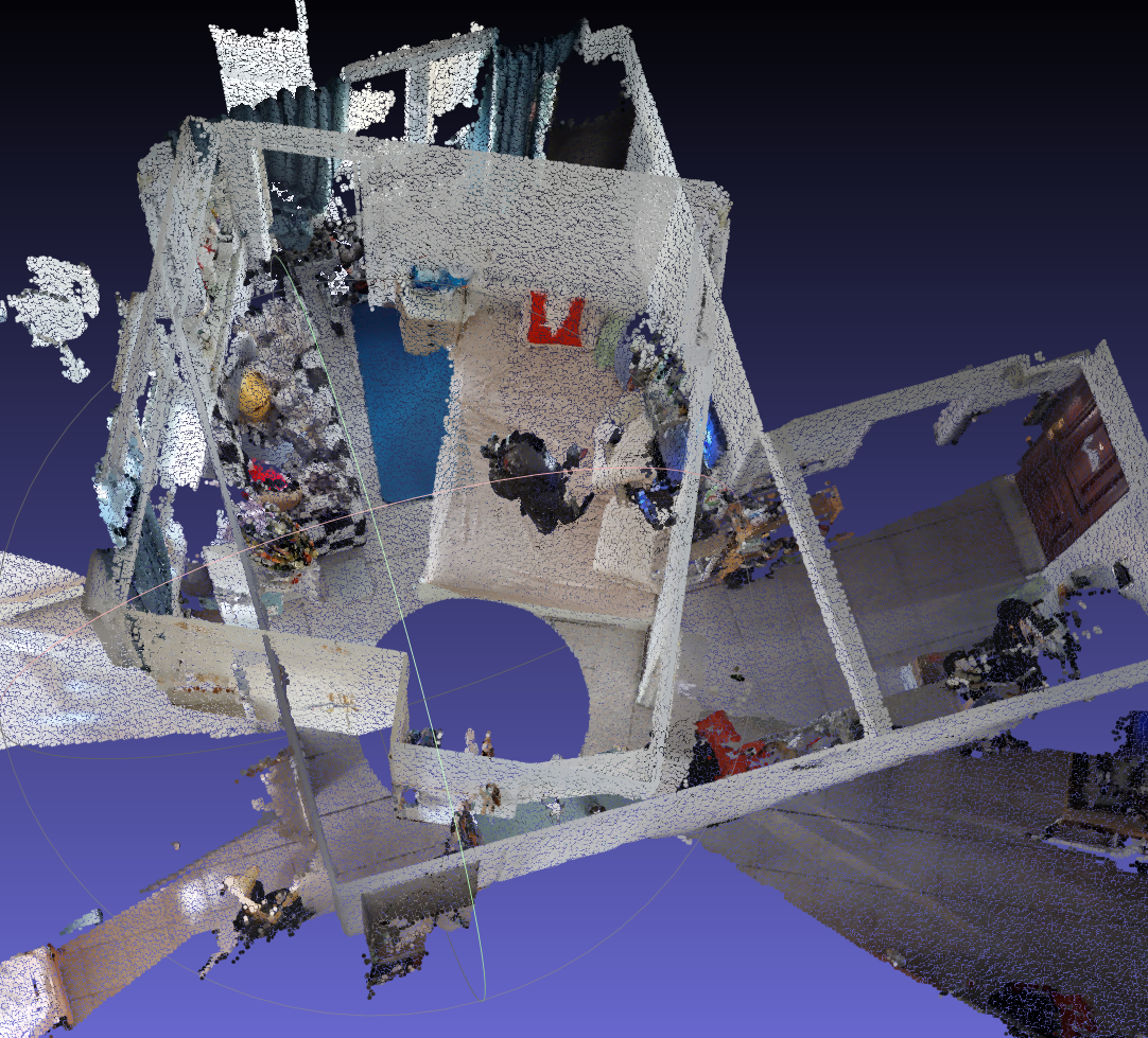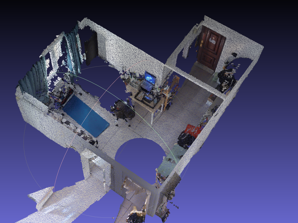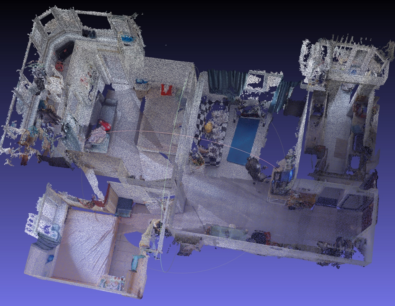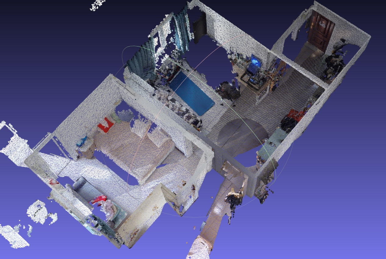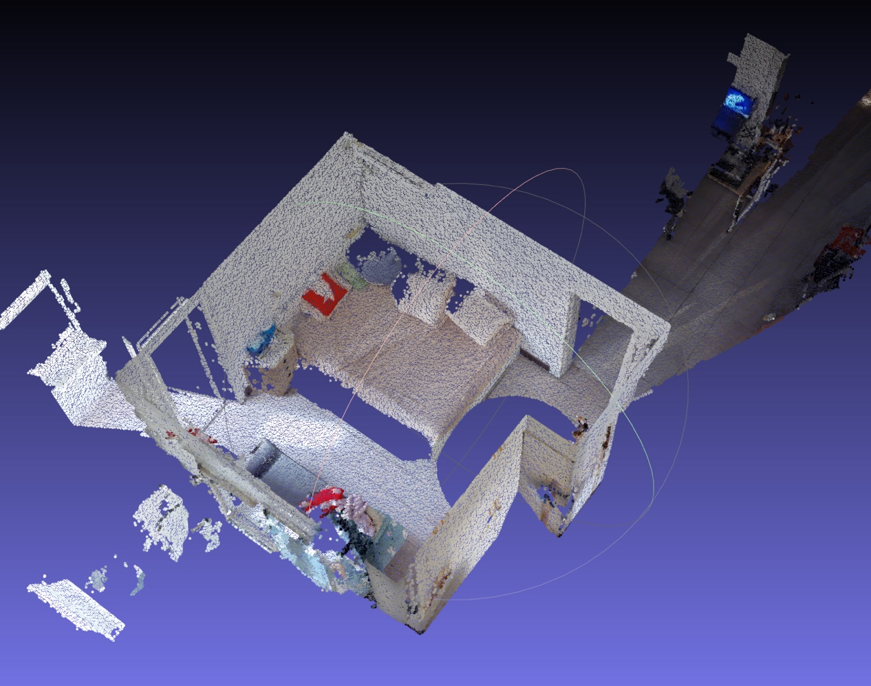 (2)点云数据不完整与遮挡:因采集设备视角限制,或现场实际环境的影响,点云数据有时存在局部缺失或遮挡。比如,针对房屋数据采集的场景,基于结构光原理的三维采集设备会收到太阳光线的影响,所以在靠近窗户阳台等存在太阳光源环境时,就会无法计算出准确数据信息而造成数据的部分缺失;再比如在一些凌乱的狭小的房间里,能够供采集设备摆放的空间很有限,而室内的物品又凌乱,就会造成物品之间的遮挡而产生数据确实。