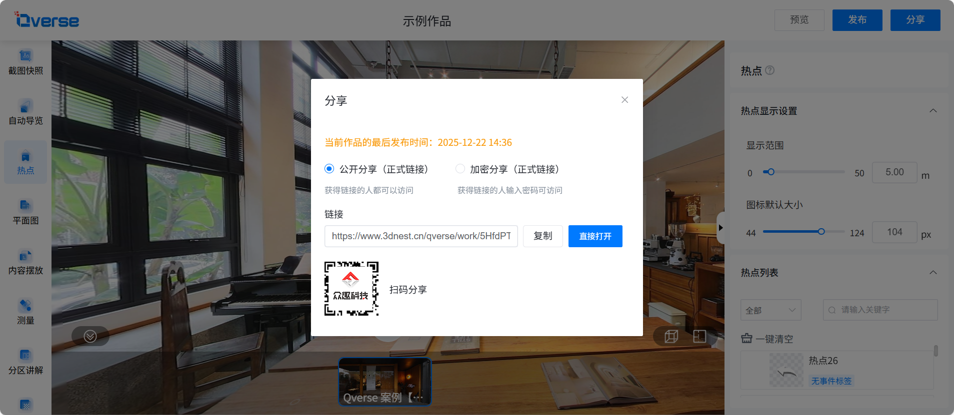 优质的数字化体验,不仅要真实呈现空间,更要让品牌价值被深度感知、并高效抵达用户。通过 Qverse 云平台的编辑功能,您可在特色区域嵌入品牌故事与设计理念,使空间本身成为可阅读、可对话的文化载体。